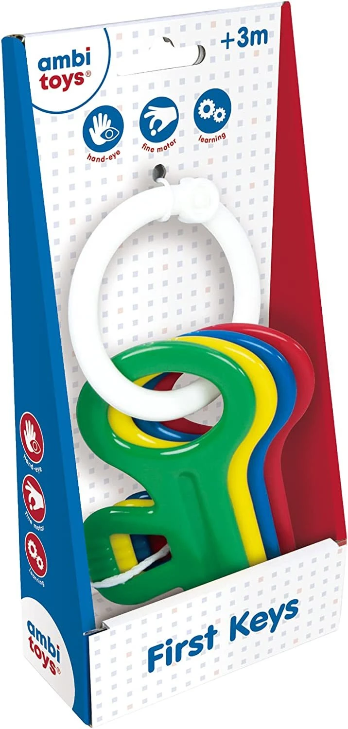 Ambi make high quality toys which retain their colour for generations, these keys will keep your baby interested and entertained as they learn to grip them and let go, passing them from one hand to the other, they are smooth and rounded but not too chunky for little ones to chew and use as a teether. The four bright colours attract them but also starts their colour recognition.Â