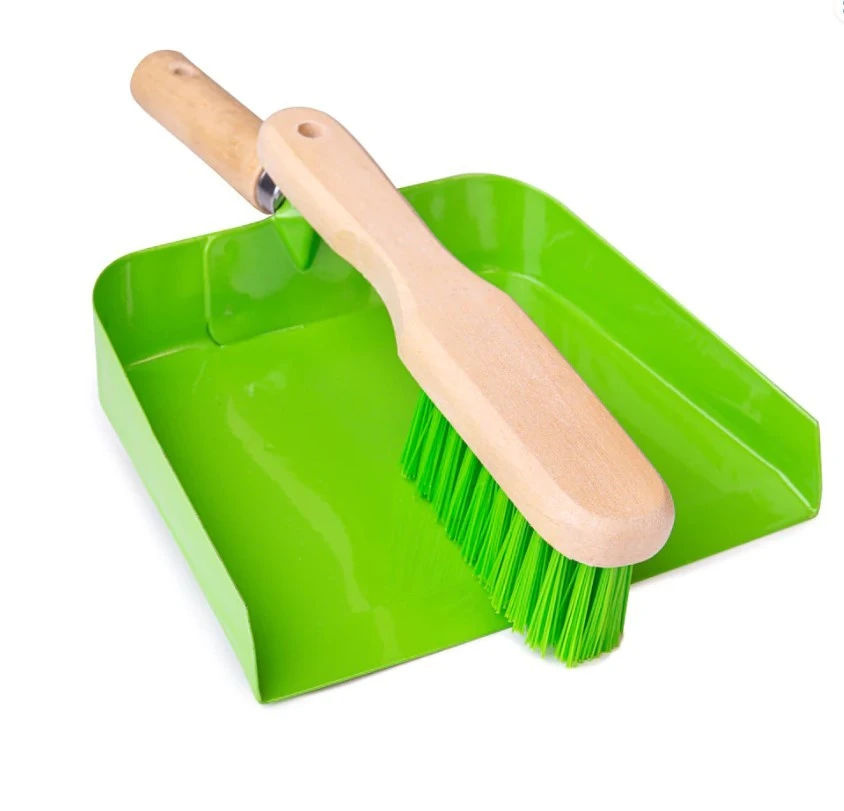 A strong metal dustpan with a good even slope on the front and a wide mouth to make it easy for little ones to use and tidy up. It has a strong short wooden handle for little ones to manage heavy loads that the have scooped up.Â