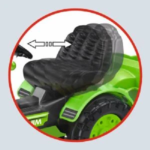 A large strong pedal tractor with loader and removable trailer. The loader lowers and tilts and holds up to 3kg. The seat is adjustable to 3 different positions, with a locking pin to slide it back as legs grow. Noisy steering wheel can be added separately. Age 3+
