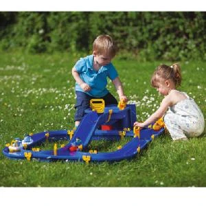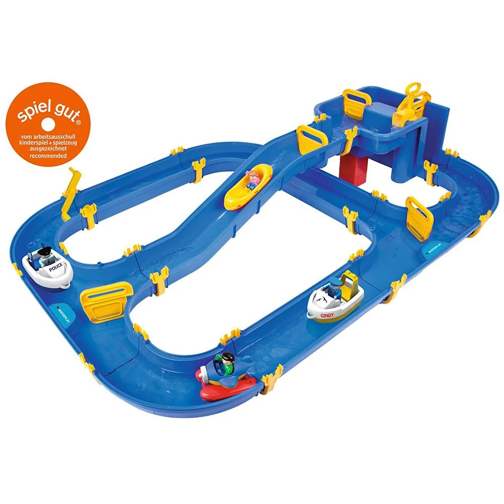 There are so many exciting features in the BIG-Waterplay Niagara set. These include a reservoir with pump and two lock gates, a downwards sloping waterway, a crank handle, as well as three different boats and a water plane to ensure that the four play figures provided can enjoy a whole variety of adventures. The boats sail quickly along the channels of the playset. The necessary current is created using the crank handle, which can be easily removed from the playset to allow the two boats provided to enjoy an uninterrupted sailing trip around the waterway system. The journey takes them through a lock system and around the system of channels. In the upper section, the reservoir provides the required current. This waterway system offers tremendous play value and its modular design enables it to be easily combined with the Rotterdam playset without the need for adhesive. Age 3 +