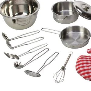 Perfectly sized for little hands, this professional looking Kitchenware Set will inspire and delight young chefs in equal measure! The stainless steel pots, pans and ladles come complete with a handy gingham oven mitt. A great way to educate little ones about every step of preparing, creating and cooking in the kitchen! Encourages creative and imaginative role play. Age 3 +