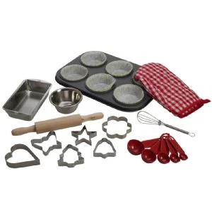 A baking set which can be used for pretend play but it also has all the equipment you need for real cooking (other than the oven), including a recipe card for muffins. Great as a present combined with the offer of an afternoons baking together. The set includes a 6 hole metal muffin tin, paper bun cases, a wooden rolling pin, a small metal loaf tin, metal biscuit cutters, with a Christmas Tree, star and bell, plastic measuring spoons, a small metal whisk, a recipe card and an oven glove. Age 3+