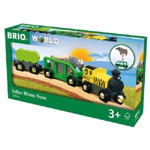 This BRIO World train with a yellow and black safari theme is all steamed up and ready to transport a very hungry rhino. All aboard, it’s time to cross the savannah in this safari-themed play scenario. The colourful wooden steam train includes everything you need to transport the rhino or any other BRIO World animal across the plains. The beautifully crafted steam engine with safari graphics comes with one wagon for transporting the rhino and one feed wagon for when it gets hungry. And of course, there is a realistic wood and plastic constructed grey rhino to complete the playset.