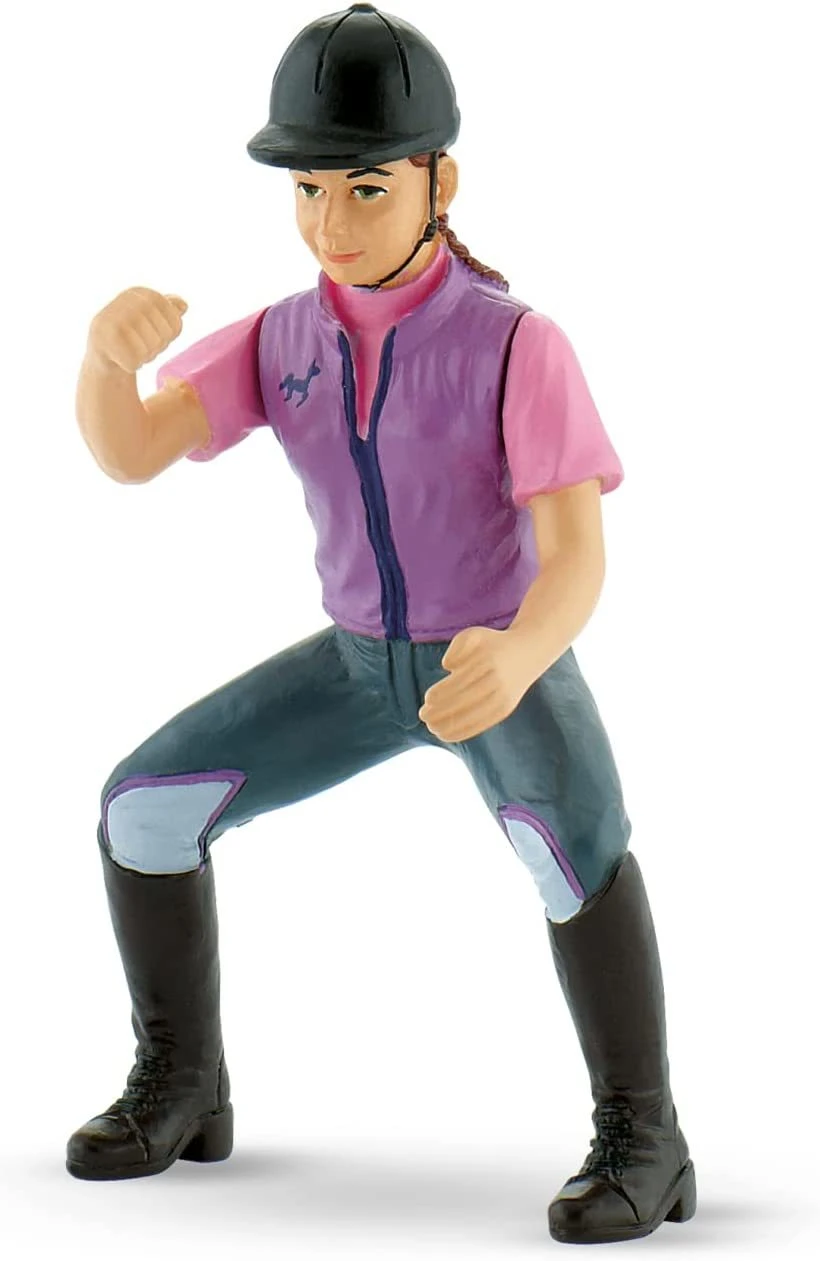 Julia is dressed ready for riding, she has her brown hair in two plaits, a pink T shirt, purple gilet, grey Jodhpurs and long brown boots. Julia is the only rider in the Bullyland collection that has moving arms, which lift up and down.