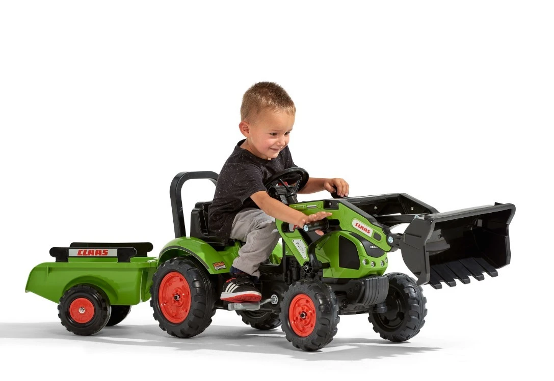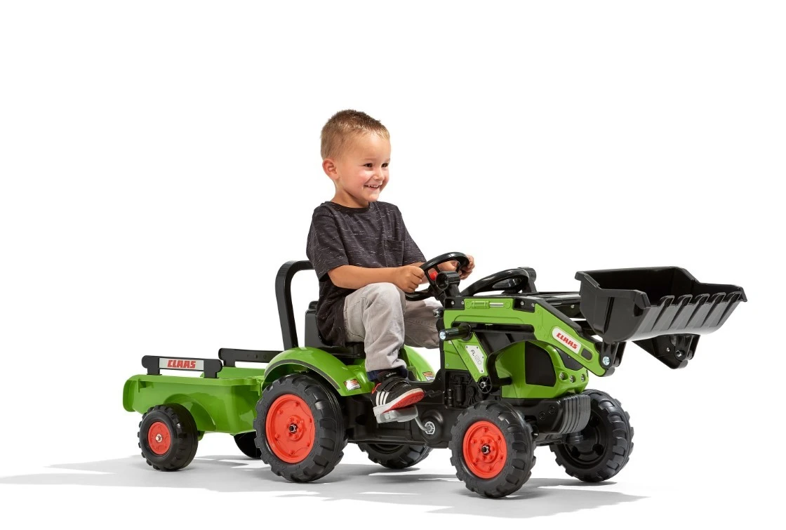 A Claas pedal tractor with loader and removable trailer, exact replica of Arion 410 model, equipped with front loader, steering wheel with horn and trailer with panelsÂ