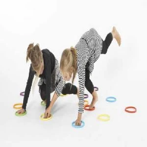This set of 6 brightly coloured rubber rings can be used for a huge number of activities that can be structured and planned or spontaneous, used by a single person or a group. Put a set of these rings out for children to play with and be amazed at how many different uses and games they come up with. Ideas include; dancing in a circle holding them, stepping stones following a path, balance the rings on your head, juggling on your arms or legs, throwing them, playing hoop la between people or targets or coming up with your own ideas.
