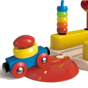 A wild and wiggly bead maze loops over this stand alone train track part, for you to play with on its own or add it to your train track. The special bead train carriage included jangles the beads as it passes. This set fits into most wooden train tracks. Age 18 months +