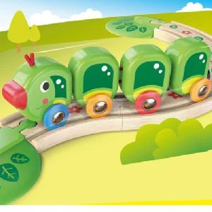 Make this hungry caterpillar wiggle is way along his track and then across the floor in search of a juicy leaf or even a piece of chocolate cake. This wooden caterpillar train has body segments which are joined together to enhance his wiggle. The 3 curved track pieces will join up to other wooden train tracks and the two ramps allow the train to go off rail and onto the floor to continue its journey. Age 18 months +