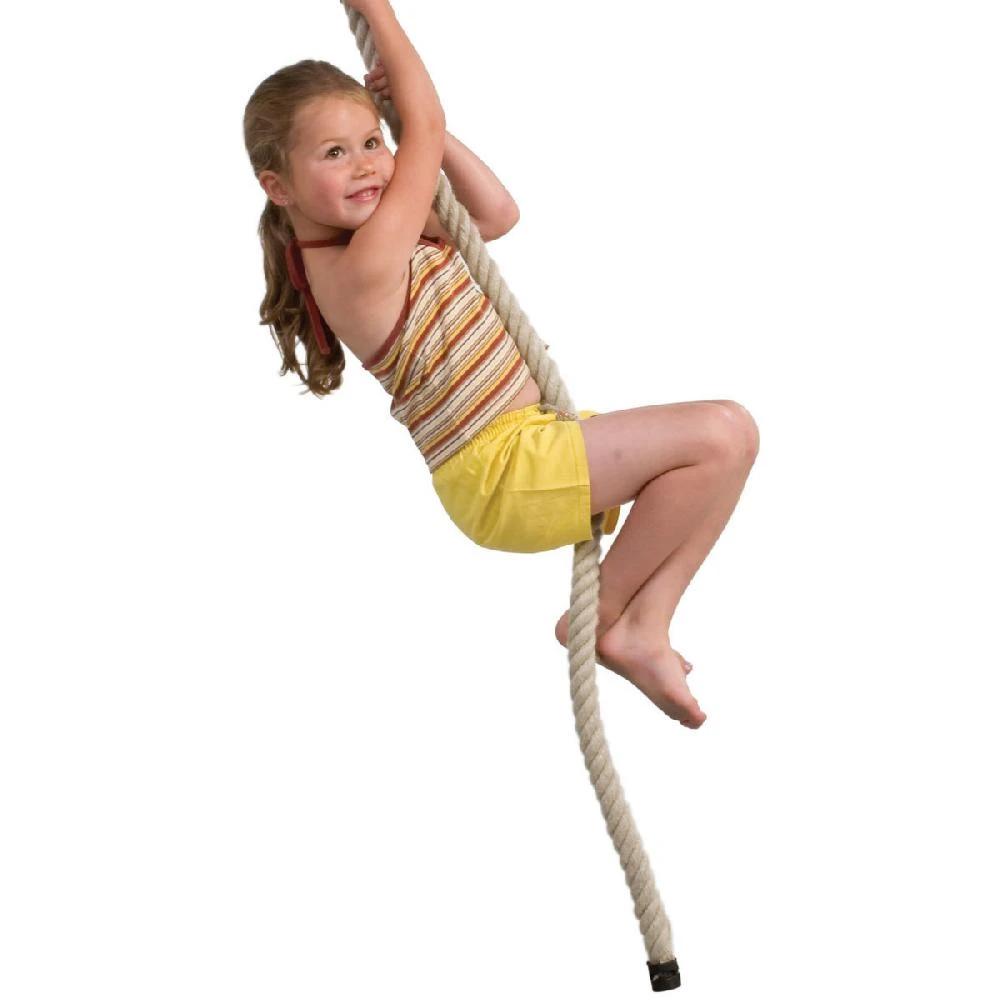 A Climbing Rope made of polyhemp rope which is a synthetic rope so wont rot but feels like a natural rope to be kind to hands, with a galvanised steel ring at the top, it can be attached to a swing, climbing frame or strong tree branch. Various lengths available, with and without knots.