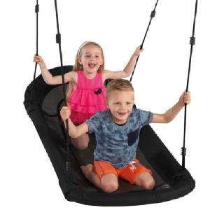 The KBT Grandoh Nest swing has an extra large seating area creates the impression of being in a rocking boat which adds to the fun, it can also be used as a hammock. The steel frame has soft impact zones all around that guarantee safe play. The Grandoh is made from water repellent fabric with a PE mesh seating area. Fits a standard swing place on your swing frame. Max user weight 150kg. In Black, max rope length 180cm, has rope adjusters.