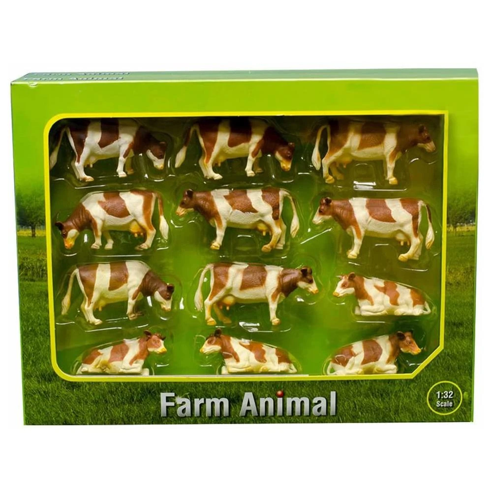 A collection on 12 Brown and White cows, to extend your herd. Cows are standing, lying or with their heads down grazing. 1:32 scale.