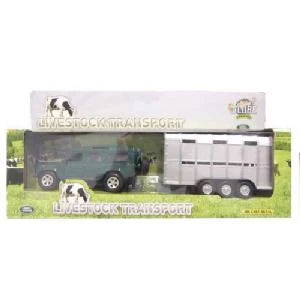 A model Landrover and stock trailer great for moving your animals around the farm. The landrover comes with a tow bar, so back up hitch on your trailer and off you go, when you are ready to load lower the back door down and let your cow out. (fits 1:50 size animals standing up)Colours may vary.