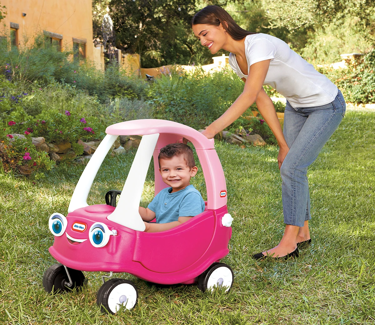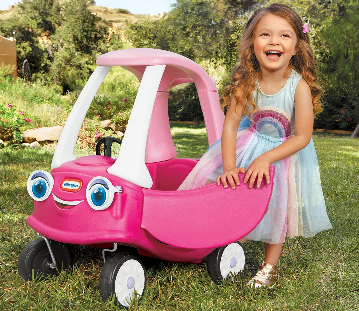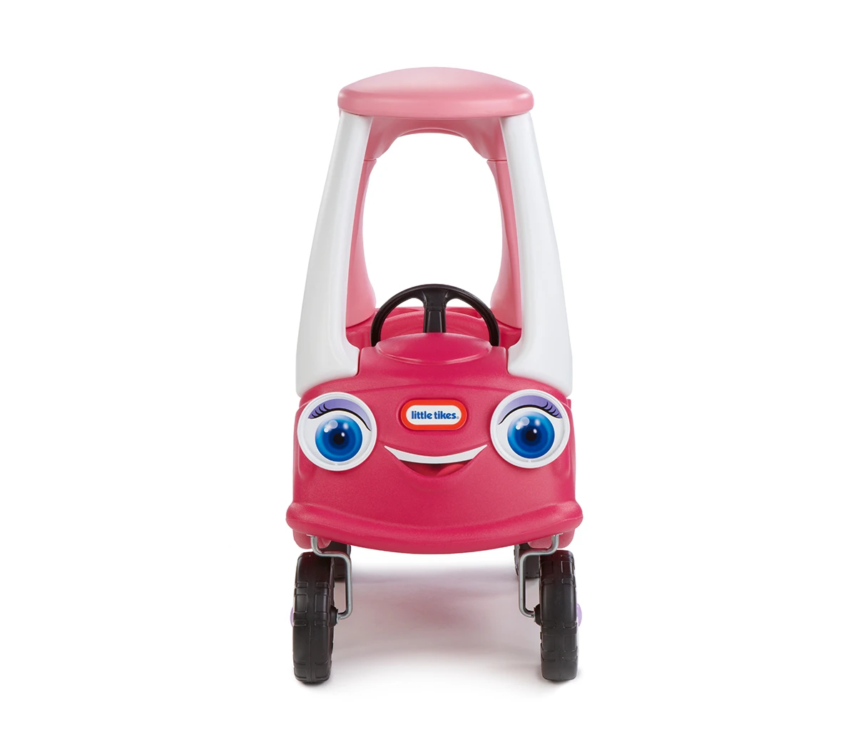 A new version of the Little Tikes classic Cozy Coupe, this one has friendly eyes on the front and a handle on the back of the roof to make it easier to push.