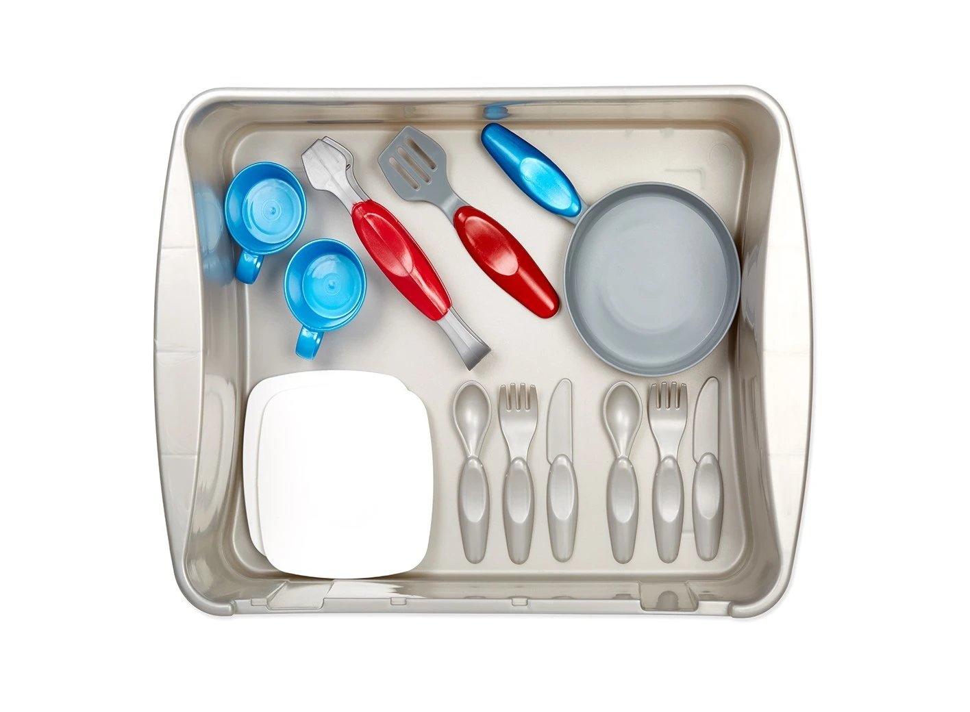 The set comes with frying pan, spatula, tongs, 2 cups, 2 plates and 2 sets of cutlery.