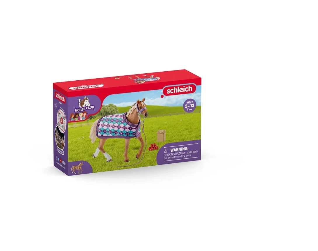 A Thoroughbred horse with its mane plaited up, looking ready for the show ring, it also comes with a rug, head collar, lead rein which can be taken on and off, when you need to lead it round.Â