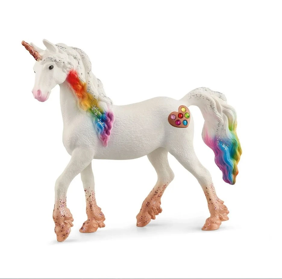 A stunning Rainbow Love Unicorn Mare, with a glowing gold horn, glitter and rainbow tips to her flowing mane and tail and gold glitter in her golden feathers and hooves which leave magical hoof prints.
