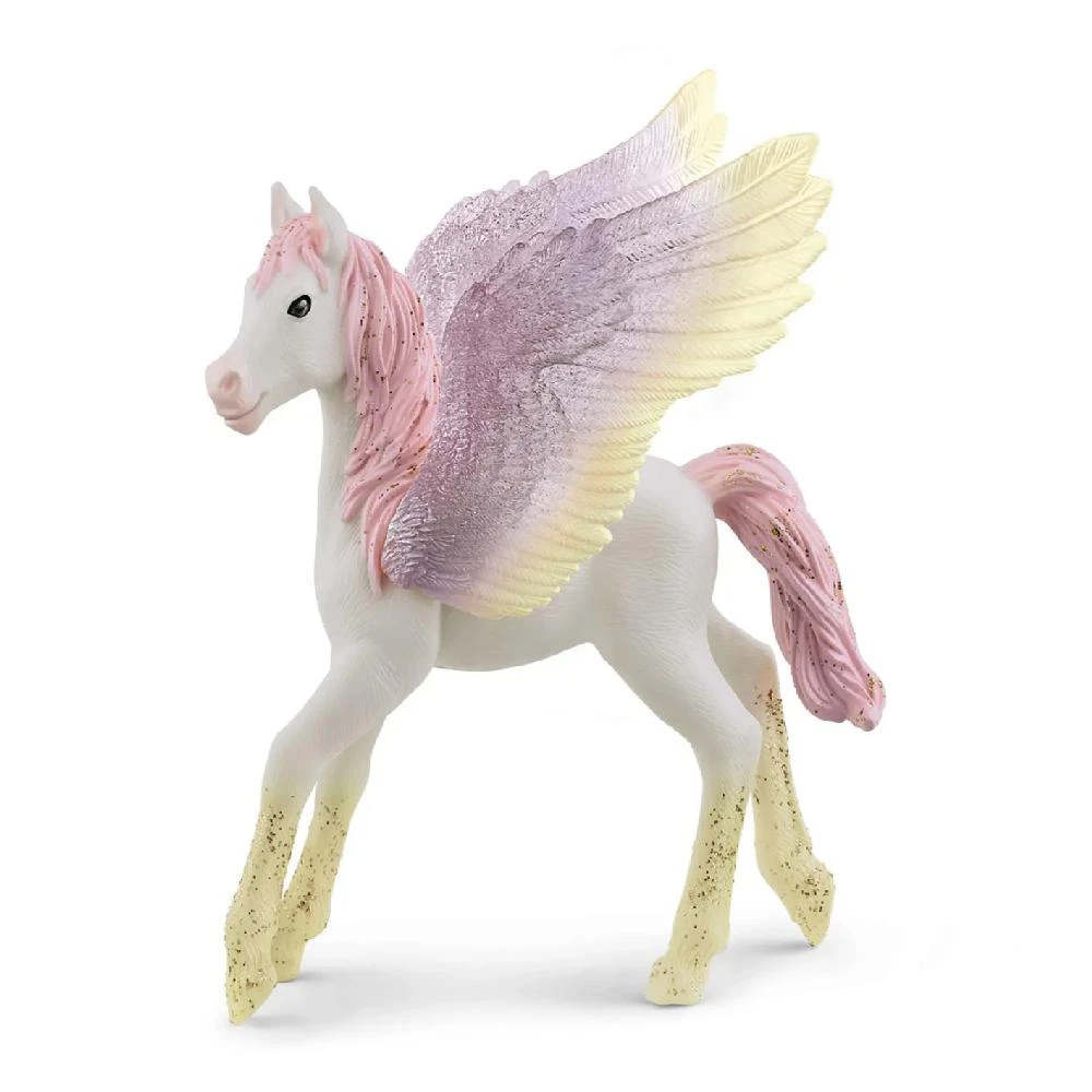 The pinks, yellows and sparkle of a perfect morning sunrise, this winged foal will take you on all the adventures in the clouds. It has a glittery mane, hooves, fetlocks, tail and wings. The wings are iridescent with feather details and are ready to open and fly. Age 5+ The mother Pegasus is also available.