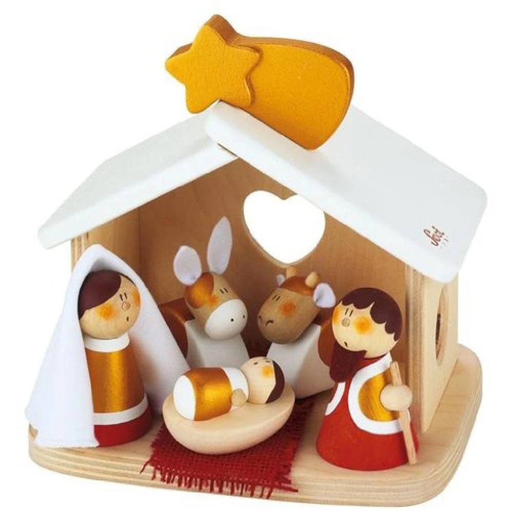 A beautiful little wooden nativity set, that will quickly become a Christmas family tradition to set out, as it looks fantastic on a table at Christmas but is more than robust enough for little hands to play with it. The stable scene comes with, an open stable with a star, Mary, Joseph, Baby Jesus in his manger, a Donkey and a Cow The set comes in a storage box so you can pack it away on the 12th night and keep it as a special toy. Designed and made by Sevi a world renowned Italian wooden toy company, in natural wood, with touches of white and gold paint. Age 3+