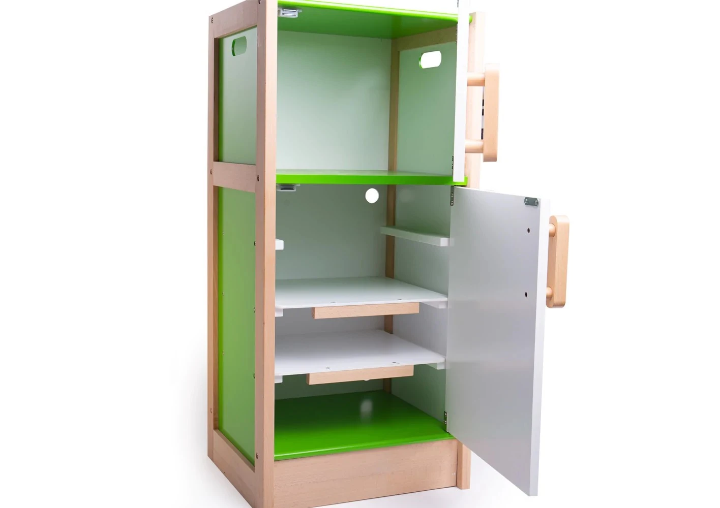 A wooden Fridge to add to your kitchen area because every kitchen needs a fridge unit. This large well-built strong unit has 2 doors just like on many real units, one could be a freezer. The lower section has movable shelves to allow you to set them up at the perfect hight for the items that will be added.Â