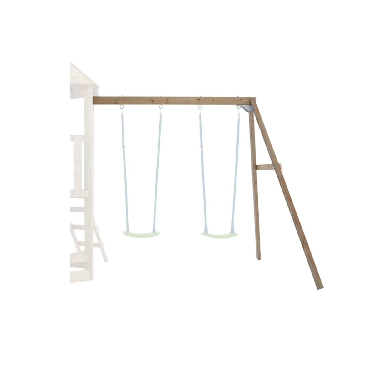 Add this double swing to the side of your Castlewood to turn it into an all in one play frame with climbing and swinging. The frame comes empty with fixings for any 2, roped swings, baby seats or other accessories for a single person. All the single person roped accessories on our website will fit this swing across the ranges, if you would like to check, please contact us.