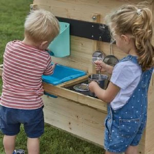 A large mud kitchen to fit to the inside or outside of your wooden playhouse, climbing frame or even a fence or wall. This kitchen has a large removable bowl, water butt with tap, hob area and a place to hang your equipment. It comes with 3 pans and a whisk and a stencil to create your own hob rings and mud kitchen logo. Bowl will hold 10kg of mud or 10 litres of water.