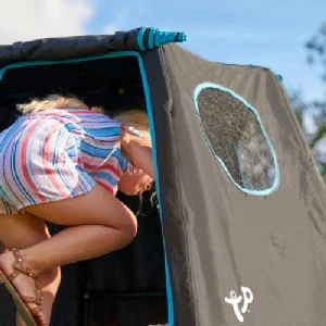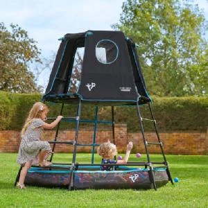 TP Toy best-selling climbing frame now available in deluxe black edition Comes complete with platform and removable den with several openings and port hole window. You can climb up to the platform up the metal frame rungs or up a cargo net. The platform creates a shaded play area over the skirt base that can be used as a sand or ball pit. Modular by design, it is possible to add some great accessories separately now or in the future as your children grow including a Jungle Run, Monkey Bridge or a Swing Arm all in Black or Blue. You can also add a Crazy Wavy Slide (no slide bar required) and a Basketball hoop.