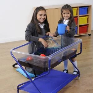 This table is great for water activities; play, exploration and experiments, the deep tray allows several children to play with water and be fascinated as they see what’s happening under the water as well as watching from the top. The Rock edge in the corner turns a tray into something more for playtime and rounded edges ensure comfort as they lean over. The strong steel frame is coated in a hard wearing polyester which folds for easy storage and a nylon mesh underneath creates a storage space, the casters at one end of the frame allow the unit to be moved easily when built but stop it moving around whilst children play.